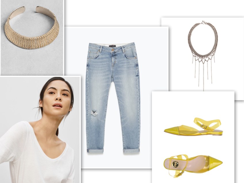 Boyfriend jeans, white t-shirt, necklace, yellow shoes Published April 3, 2015 at 1600 × 1200 in Jeans + t-shirt/shirt + statement necklace