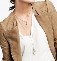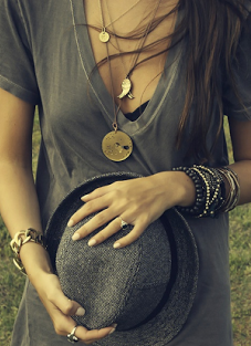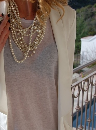 Simple top with several thin and less thin necklaces in different lengths and materials/textures/etc.. Don’t over do it though or you will end up looking like the A-Team’s B-A!!