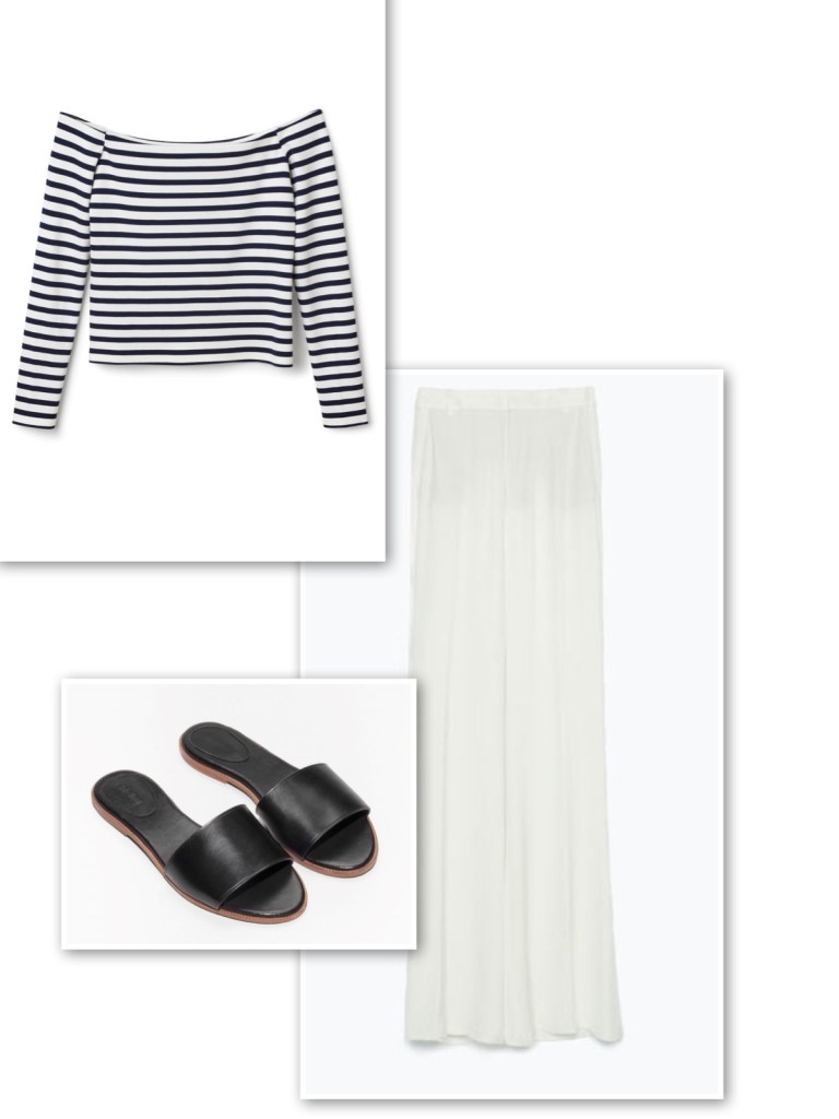 Off shoulder stripy top with white loose trousers and slides Published April 25, 2015 at 1200 × 1600 in Off shoulder tops