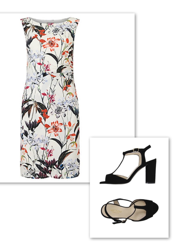 White floral dress + black sandals