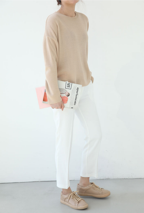 dbe-beige-jumper-white-trousers-beige-treniers
