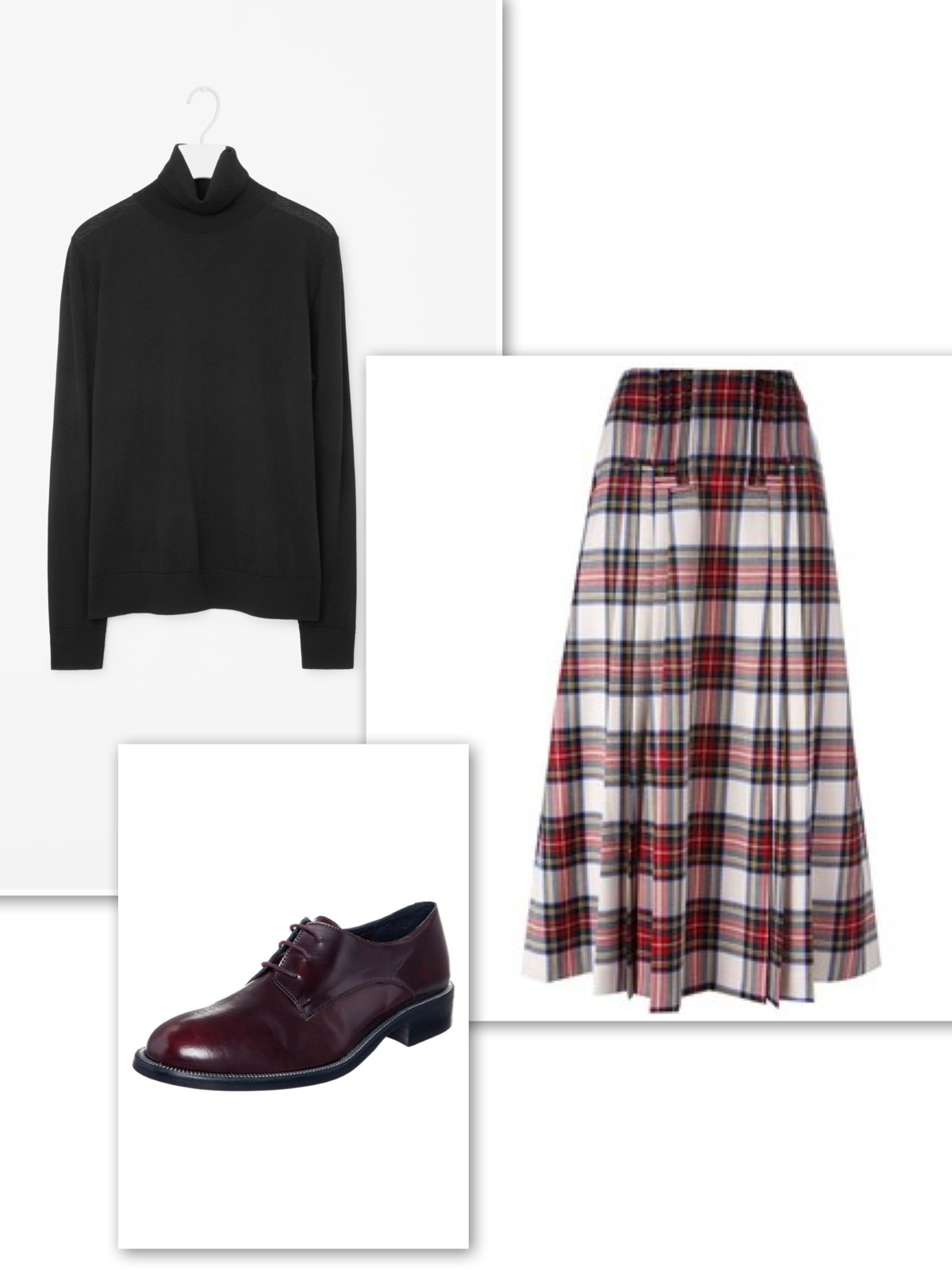 polo-neck-sweater-tartan-skirt-brogues Published October 11, 2016 at 1200 × 1600 in Graphic t-shirt + long pleated tartan skirt + flats